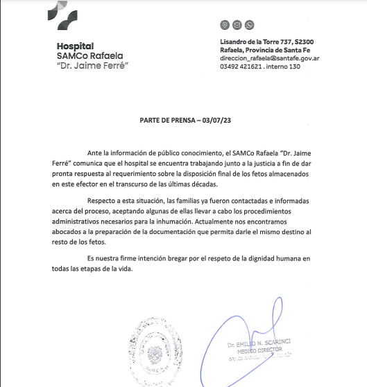 Según informó Sergio Boschetto, corresponsal de Radio EME en Rafaela, «Aseguran que muy pocas vieron el cuerpo del bebe en gestación e hicieron todos los trámites para enterrarlos. Muchas desistieron de eso».