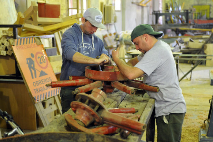 Miguel Ángel Acosta es el encargado de la sección de carpintería de los talleres municipales y contó cómo se concreta el proceso de reconstrucción. Según dijo, la labor se completa “con madera de desplante: por ejemplo, si se cae un árbol en la calle, lo traen acá y lo hacemos tabla. De ahí sacamos para hacer una de las ruedas que se armó completa”.