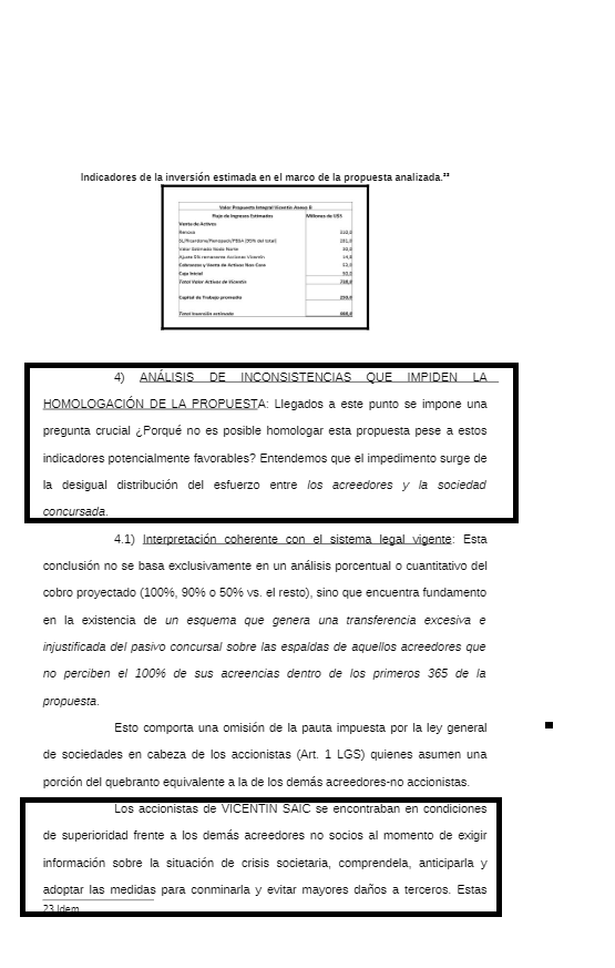 El fallo del juez Lorenzini establece «Rechazar el pedido de homologación de la propuesta concordataria presentada por la sociedad Vicentin Saic» y «ordenar la apertura del período de concurrencia (Art. 48 Ley de Concursos y Quiebras)». También afirma que «Mantiene la administración societaria en sus directores naturales y continúa la intervención societaria».