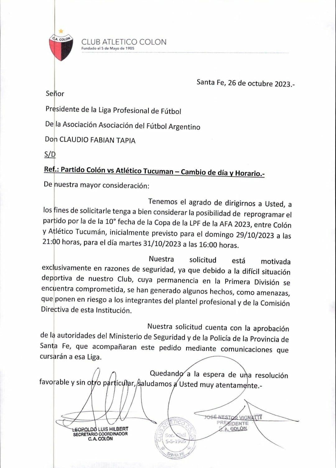 «Tenemos el agrado de dirigirnos a Usted, a los fines de solicitarle tenga a bien considerar la posibilidad de reprogramar el partido por la de la 11° fecha de la Copa de la LPF de la AFA 2023, entre Colón y Atlético Tucumán, inicialmente previsto para el domingo 29/10/2023 a las 21:00 horas, para el día martes 31/10/2023 a las 16:00 horas», rezaba el escrito de la dirigencia rojinegra.