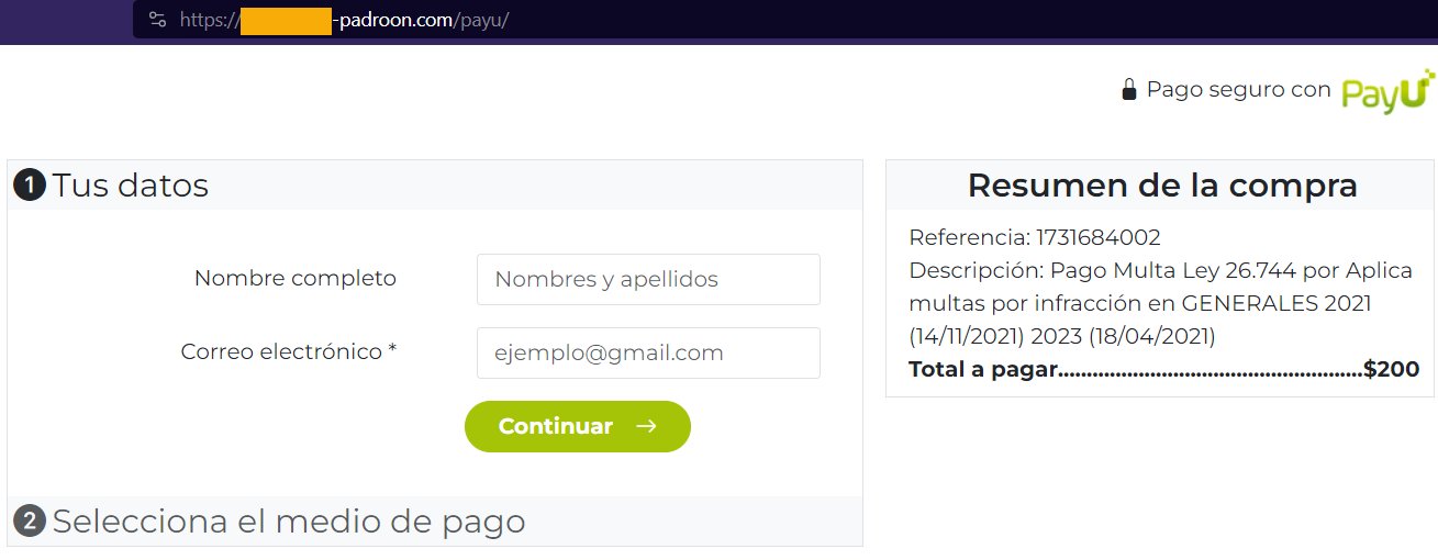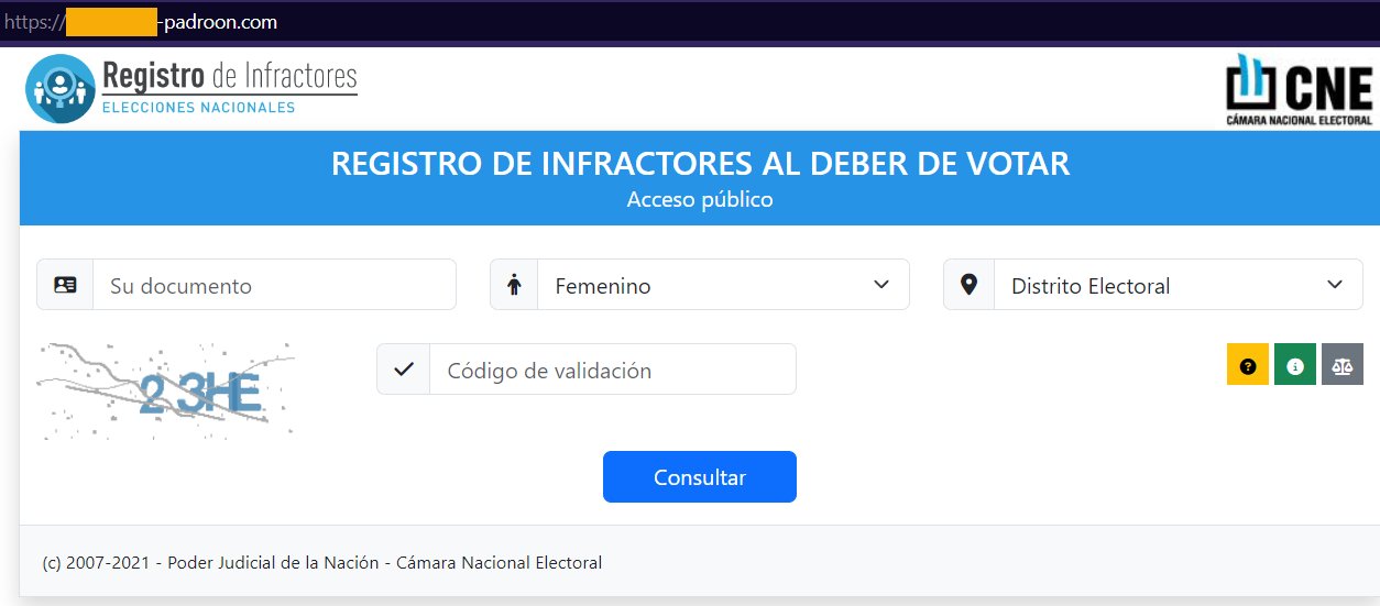 El sitio «….padroon.com» (se borra el inicio para no generar tráfico ilegal) engaña a sus víctimas con su aspecto idéntico al sitio oficial https://www.padron.gob.ar/