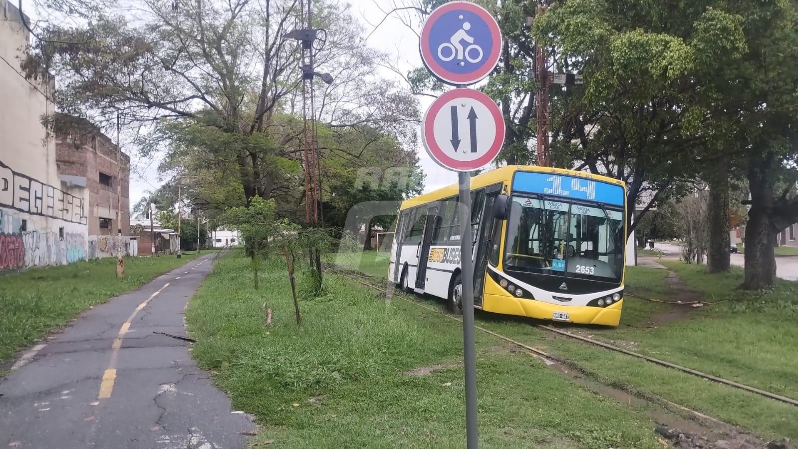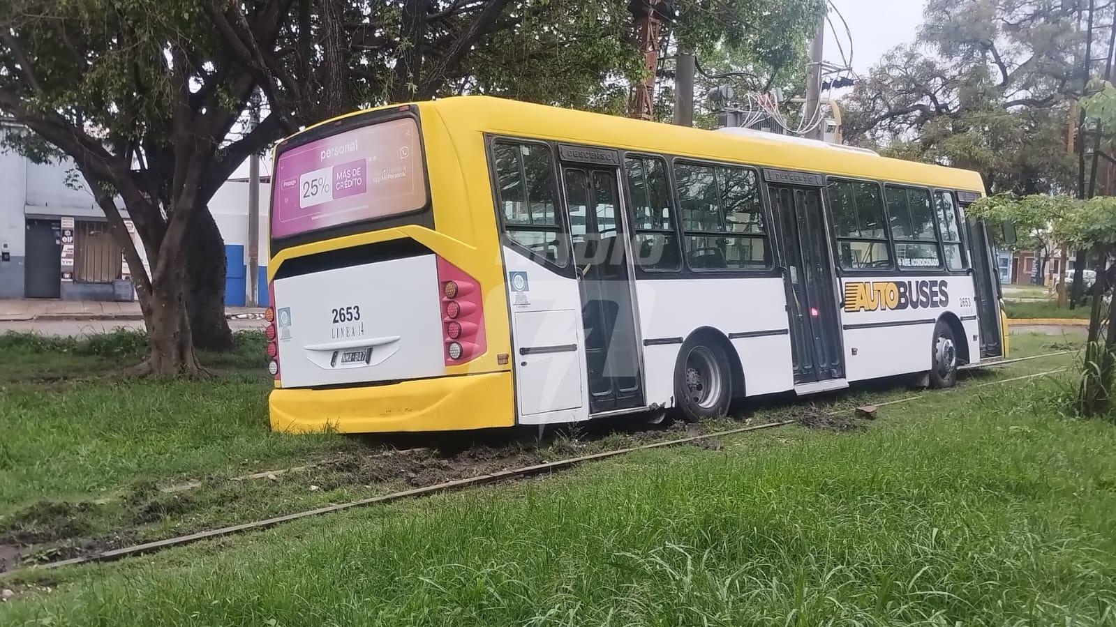 El hecho ocurrió en Avenida General Paz y Pedro Zenteno. Se trata de una unidad de la línea 14 que intentó evadir las calles inundadas, y terminó varado sobre las vías del ferrocarril. Sus dos ruedas izquierdas se trabaron en el barro y le impiden trasladarse.