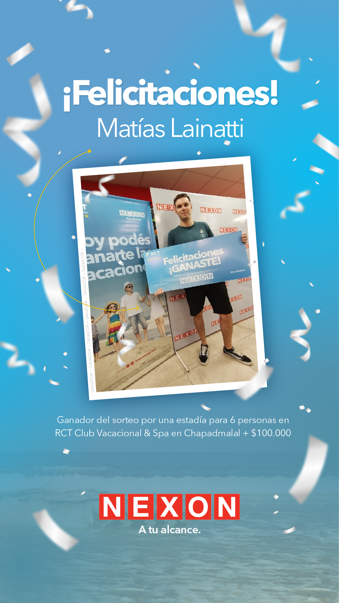 El pasado viernes 24 de noviembre Nexon llevó a cabo con éxito el sorteo de una semana de vacaciones en RCT Club Vacacional & Spa ***** en Chapadmalal más $100.000 resultando ganador Matías Lainatti.