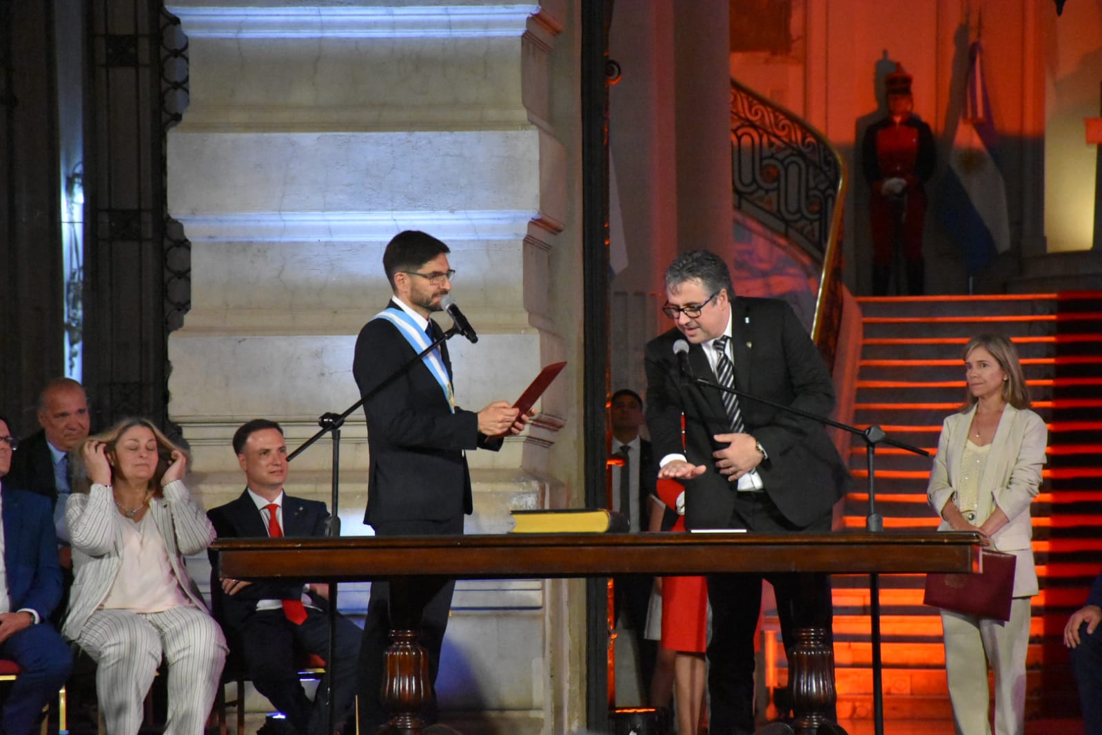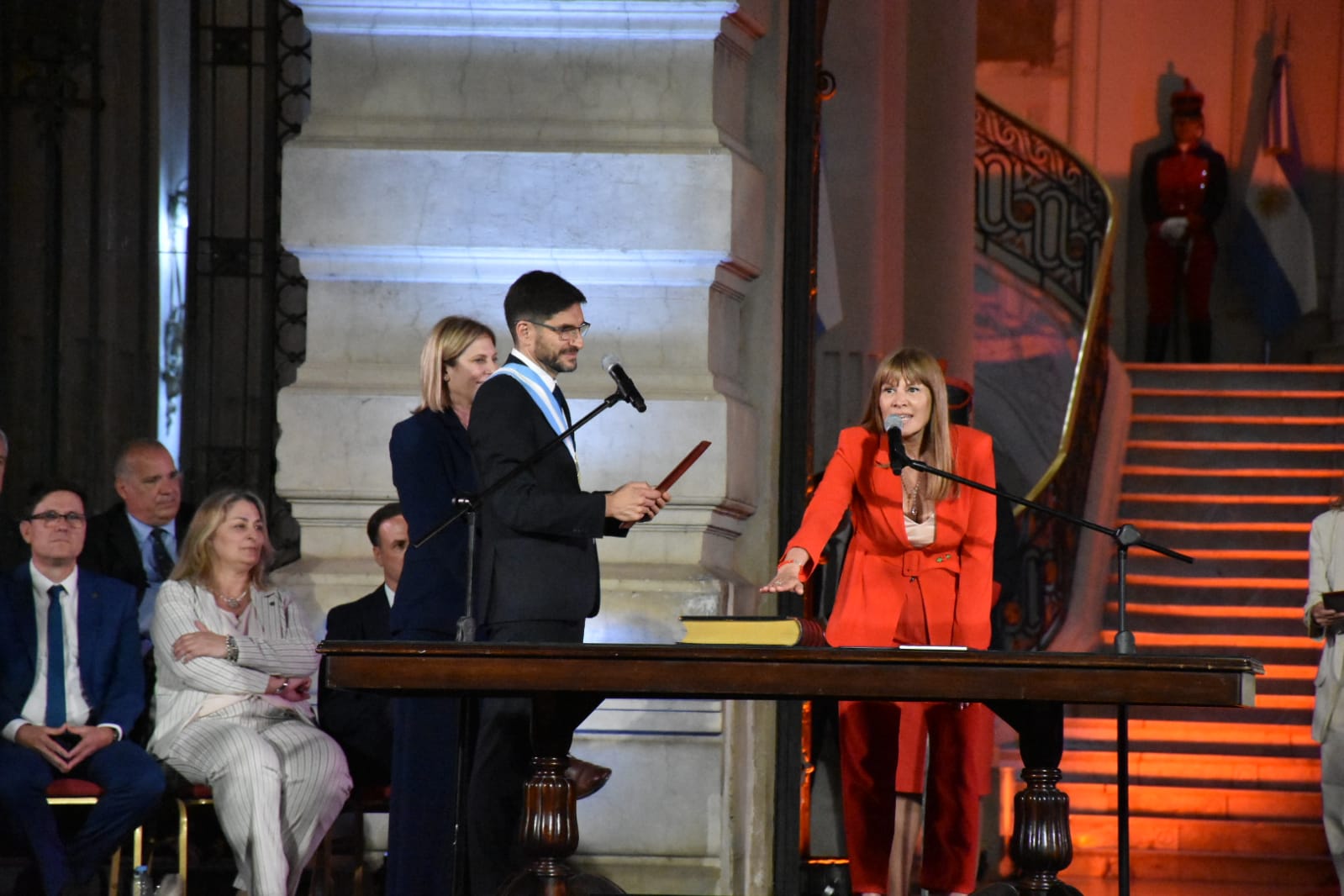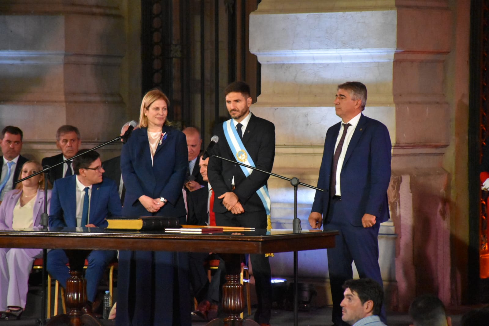 Más tarde, puso en funciones a sus ministros. Hubo modificaciones en la cantidad de ministerios. La gestión saliente de Perotti tenía 13, mientras que la nueva de Pullaro tendrá 11. Los ministerios de Género y el de Infraestructura pasarán a ser secretarias, que serán absorbidas por otras carteras.