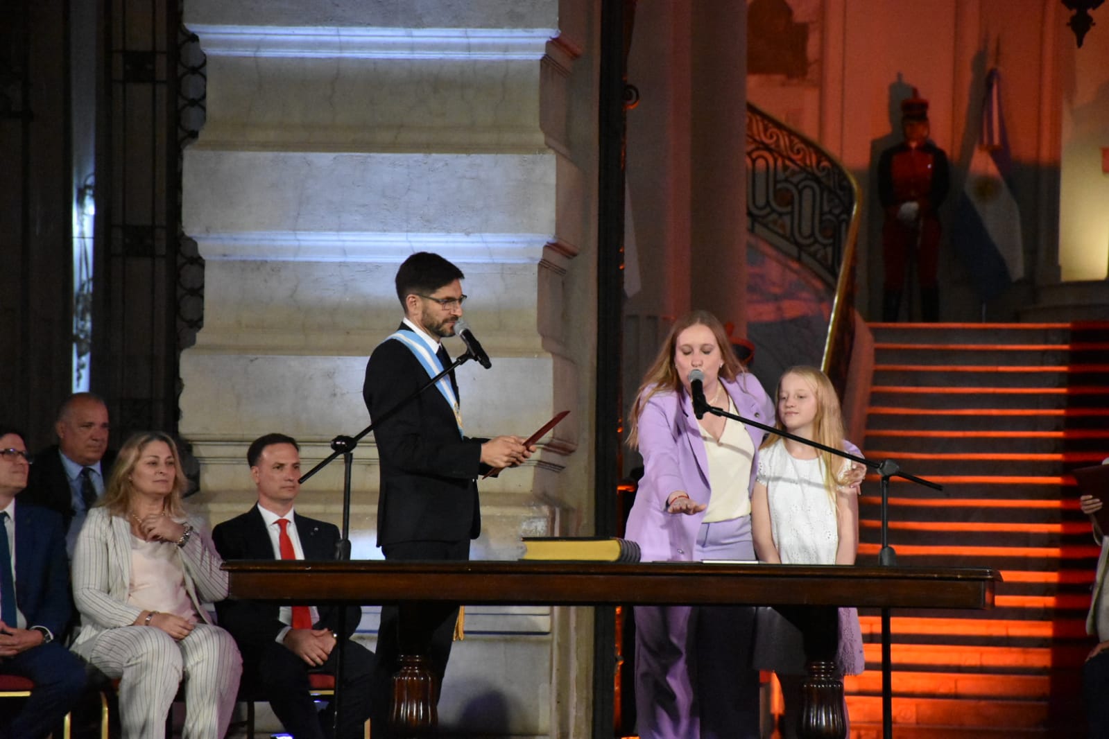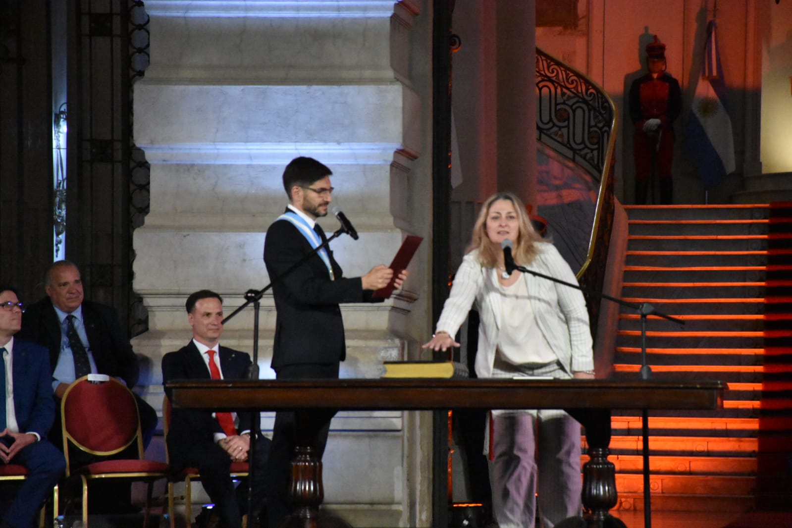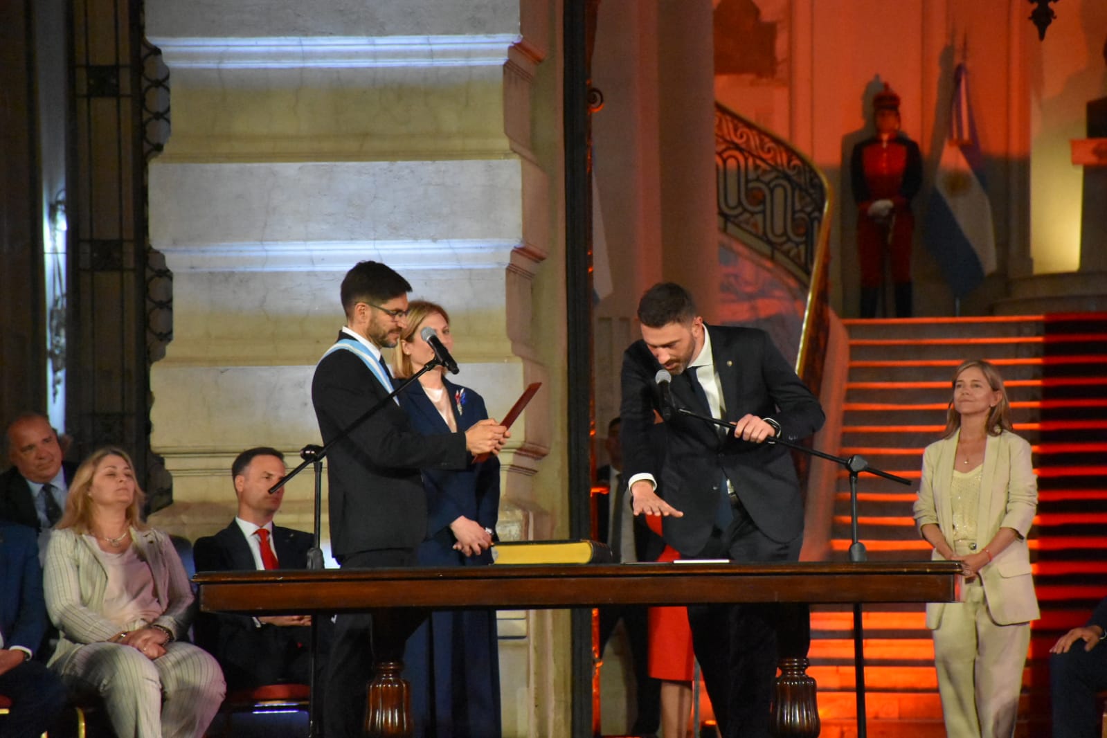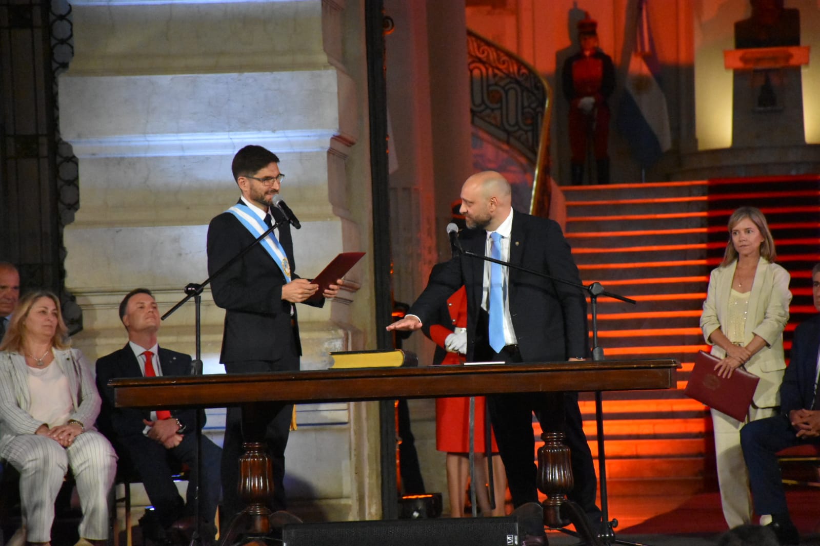 Más tarde, puso en funciones a sus ministros. Hubo modificaciones en la cantidad de ministerios. La gestión saliente de Perotti tenía 13, mientras que la nueva de Pullaro tendrá 11. Los ministerios de Género y el de Infraestructura pasarán a ser secretarias, que serán absorbidas por otras carteras.
