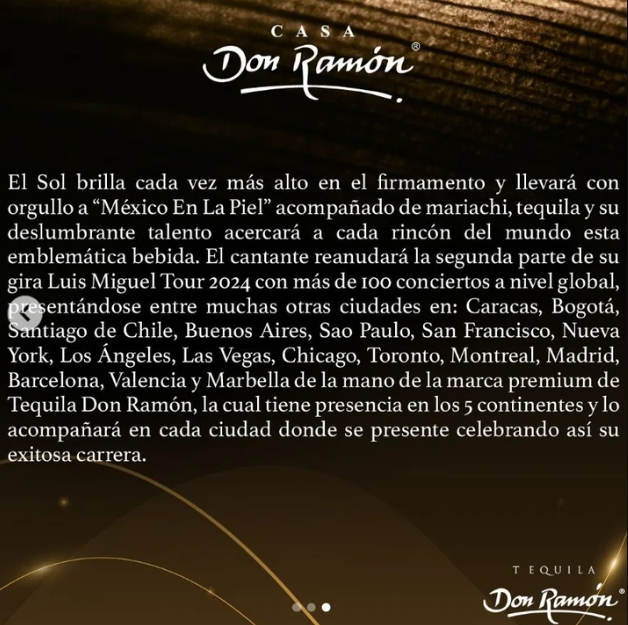 Luis Miguel Tour 2024 con más de 100 conciertos a nivel global, presentándose entre muchas otras ciudades en: Caracas, Bogotá, Santiago de Chile, Buenos Aires, Sao Paulo, San Francisco, Nueva York, Los Ángeles, Las Vegas, Chicago, Toronto, Montreal, Madrid, Barcelona, Valencia y Marbella de la mano de la marca premium de Tequila Don Ramón, la cual tiene presencia en los 5 continentes y lo acompañará en cada ciudad donde se presente celebrando así su exitosa carrera.