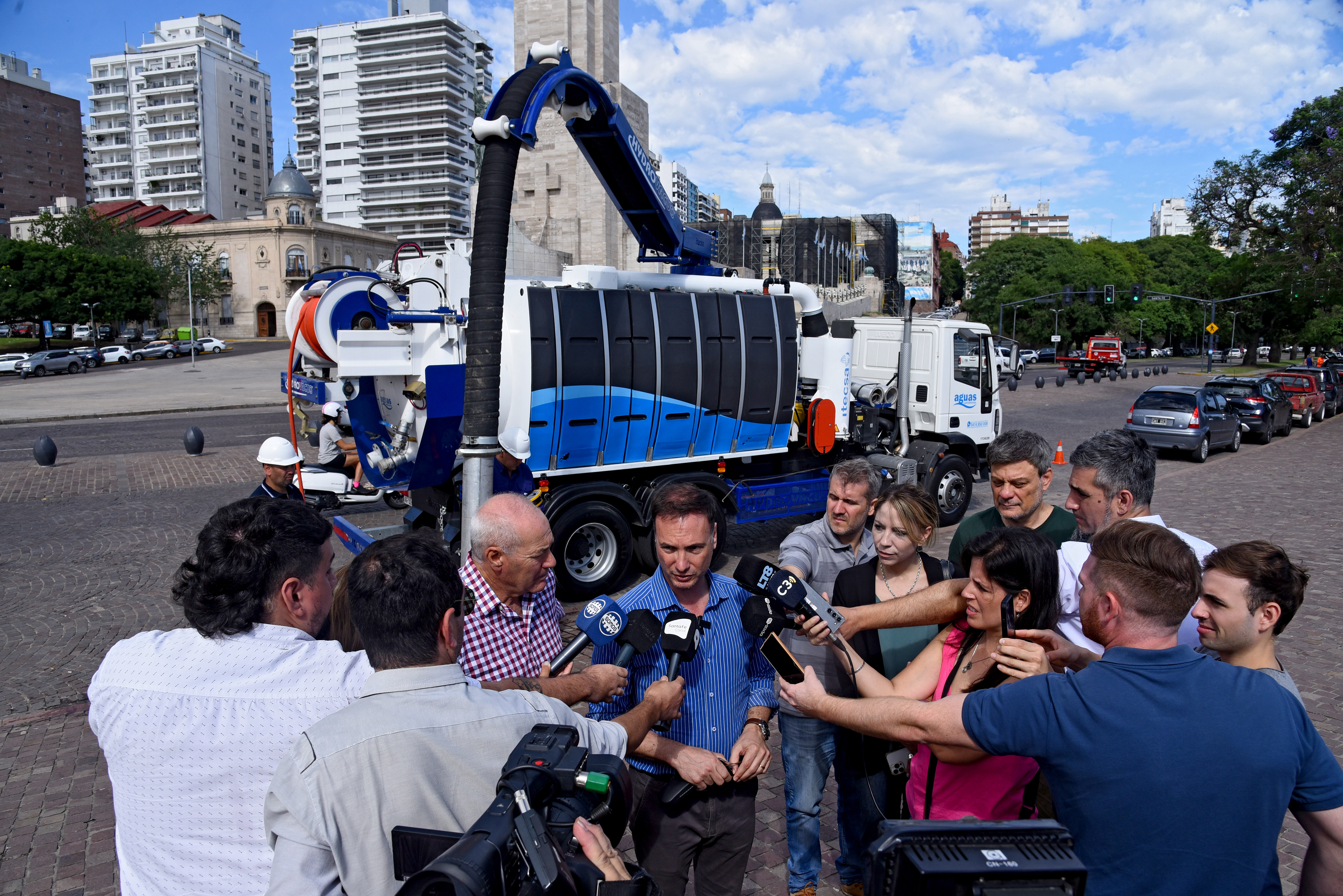 El ministro de Obras Públicas de la provincia, Lisandro Enrico, junto con la presidenta de Aguas Santafesinas S.A. (ASSA), Anahí Rodríguez, presentaron este viernes en Rosario un nuevo camión desobstructor, en el marco de un plan de contingencia elaborado para finalizar obras inconclusas de intervención en pozos, socavones y trabajos pendientes en los últimos años. La actividad se desarrolló en el Monumento a la Bandera.
