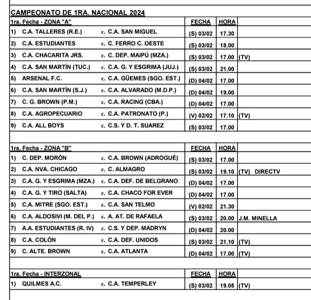 Este jueves se confirmó la programación de la primera fecha de la temporada del torneo de la segunda categoría del fútbol argentino.
