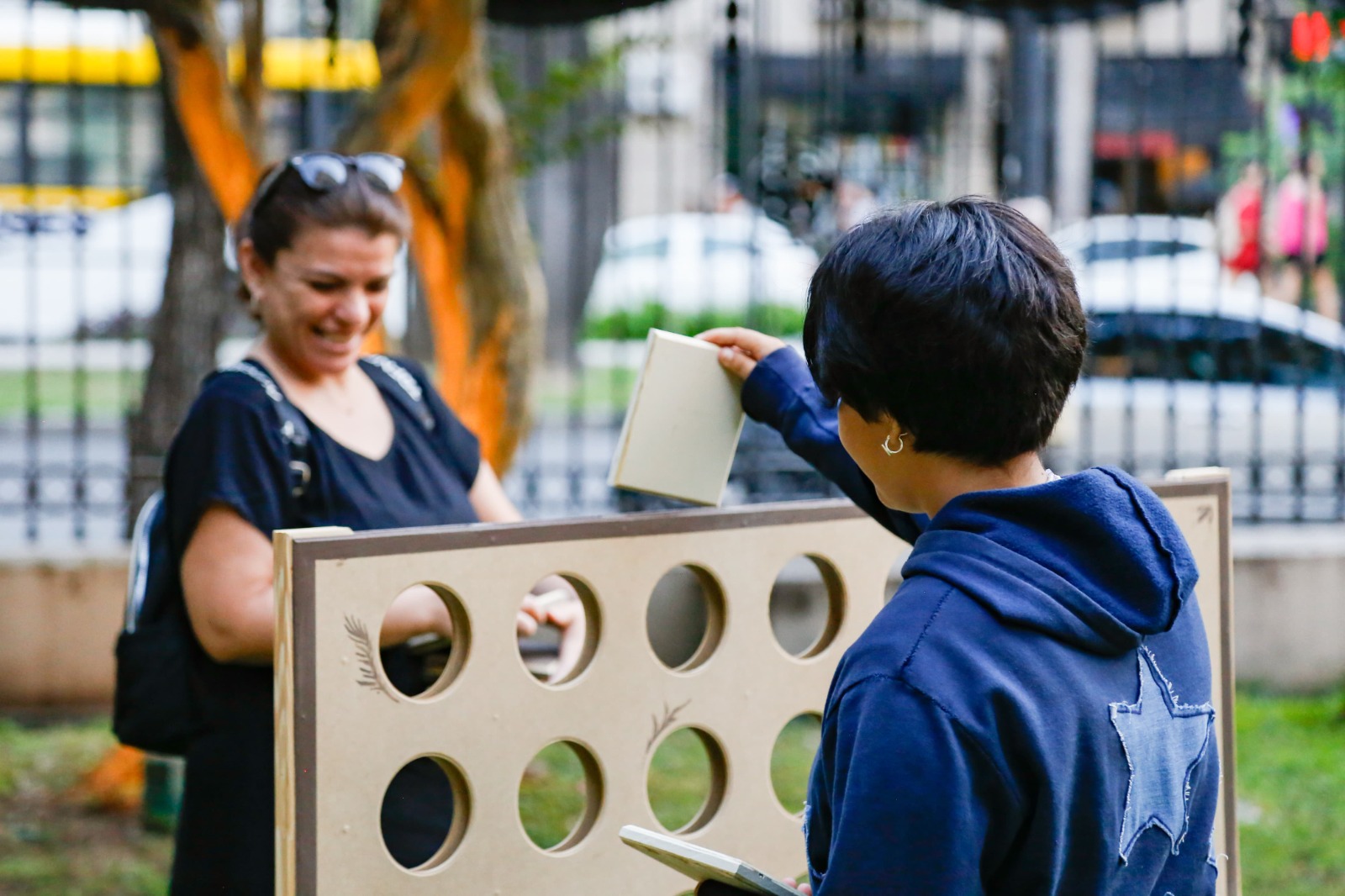 El patio de La Casa se convirtió en una plaza de juegos donde la comunidad disfrutó al aire libre de la nueva propuesta lúdica: los clásicos juegos 4 en línea, tatetí, piedra, papel y tijera y mini tejo de mesa, entre otros.