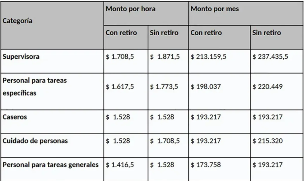 La Comisión Nacional de Trabajo en Casas Particulares negoció los aumentos según las categorías salariales, iniciando desde la más baja, correspondiente al personal de tareas generales. Los empleadores pasarán a pagar un sueldo de $1.416,50 por hora con retiro y $1.528 por hora sin retiro, llegando a un total de $193.217 mensual.