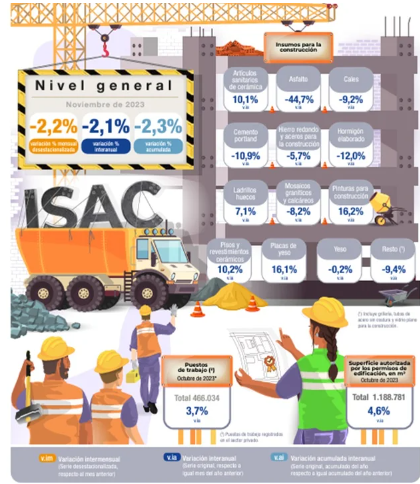 Para el caso de la construcción, los números tampoco fueron alentadores. En noviembre de 2023, el indicador sintético de la actividad de la construcción (ISAC) mostró una baja de 2,1% respecto a igual mes de 2022. Mientras que en la comparación de los once meses del año acumulados, la baja es de 2,3% sobre 2022.