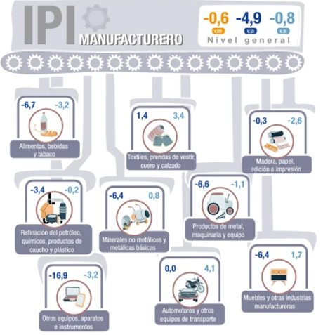 En noviembre de 2023, 12 de las 16 divisiones de la industria manufacturera presentaron caídas interanuales. En orden a su incidencia en el nivel general, se registraron caídas en “Alimentos y bebidas”, 6,7%; “Sustancias y productos químicos”, 5,9%; “Otros equipos, aparatos e instrumentos”, 16,9%; “Industrias metálicas básicas”, 8,3%; “Maquinaria y equipo”, 7,1%; “Productos de metal”, 5,8%; “Productos minerales no metálicos”, 3,9%; “Muebles y colchones, y otras industrias manufactureras”, 6,4%; “Vehículos automotores, carrocerías, remolques y autopartes”, 1,0%; “Madera, papel, edición e impresión”, 0,3%; “Prendas de vestir, cuero y calzado”, 0,5%; y “Productos de tabaco”, 5,5%.