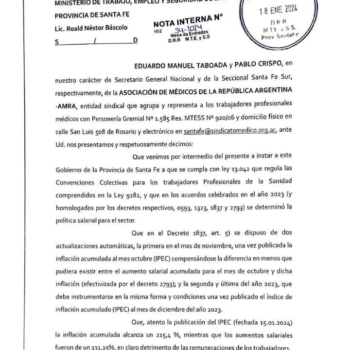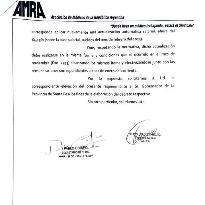 La Asociación de Médicos de la República Argentina (AMRA) envió ayer una nota al Ministerio de Trabajo, Empleo y Seguridad Social de Santa Fe para pedir que se active la cláusula gatillo con un 84,15% de aumento en base al sueldo de febrero de 2023.