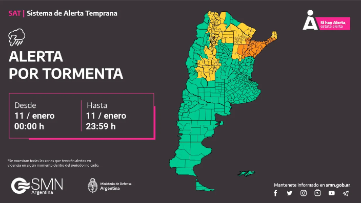 El Servicio Meteorológico Nacional (SMN) volvió este jueves a emitir alertas por tormentas fuertes, que podrían incluir granizo y fuertes ráfagas de viento, para varias localidades del país.