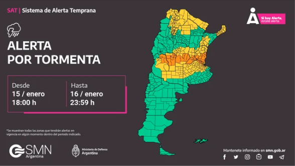Al respecto, el organismo informó que “el área será afectada por tormentas, algunas localmente fuertes o severas. Las mismas estarán acompañadas por ráfagas intensas, caída de granizo, fuerte actividad eléctrica y fundamentalmente abundante caída de agua en cortos períodos”.