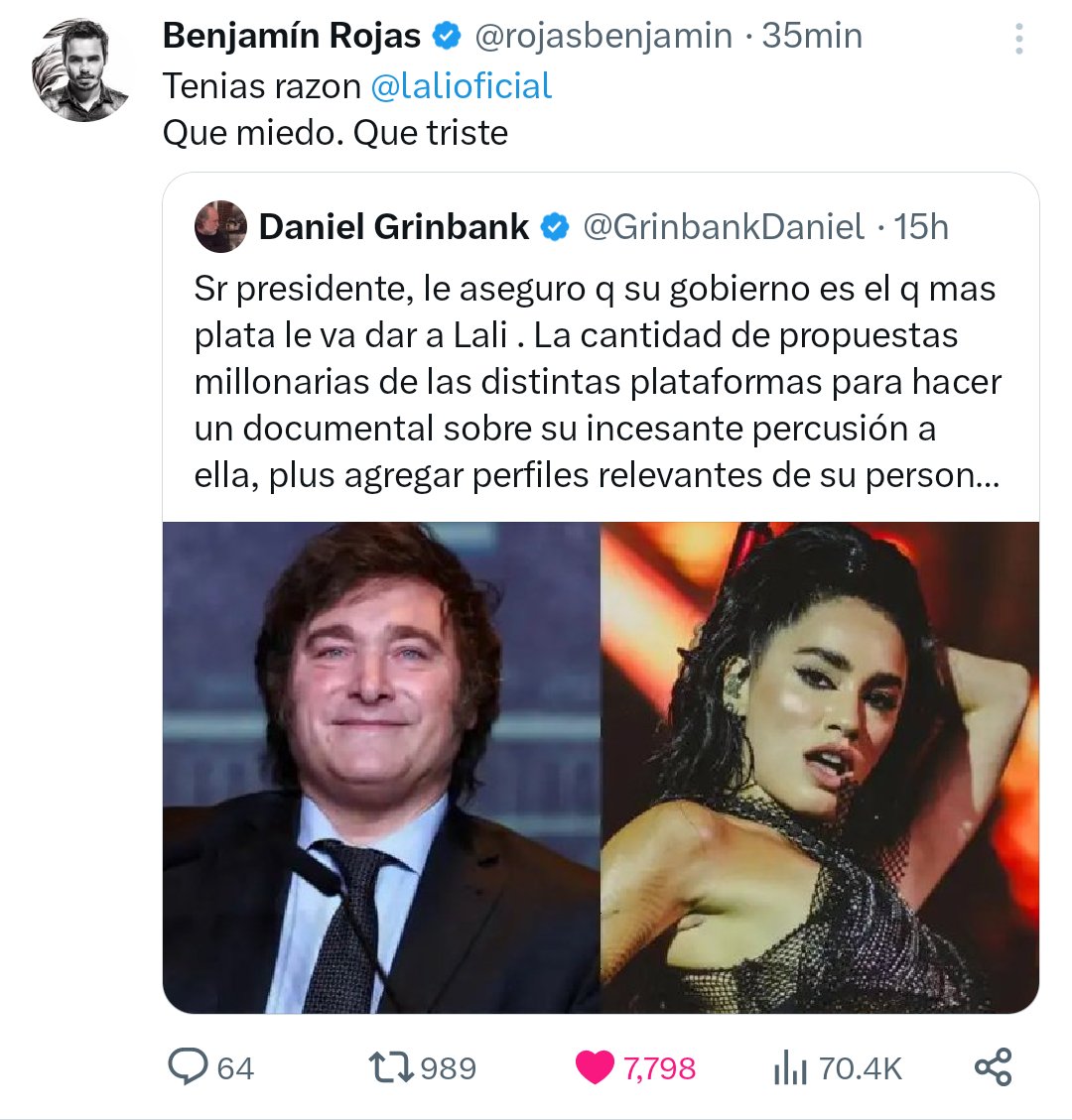 La actriz y cantante argentina Lali Espósito fue blanco del presidente Javier Milei, quien en una entrevista en el canal La Nación+ la llamó «Lali Depósito» en su afán de ratificar la idea de que recibe dinero del Estado. En la escena artística entienden que los dichos del mandatario no son otra cosa más que una persecución y comenzaron a darle su apoyo.