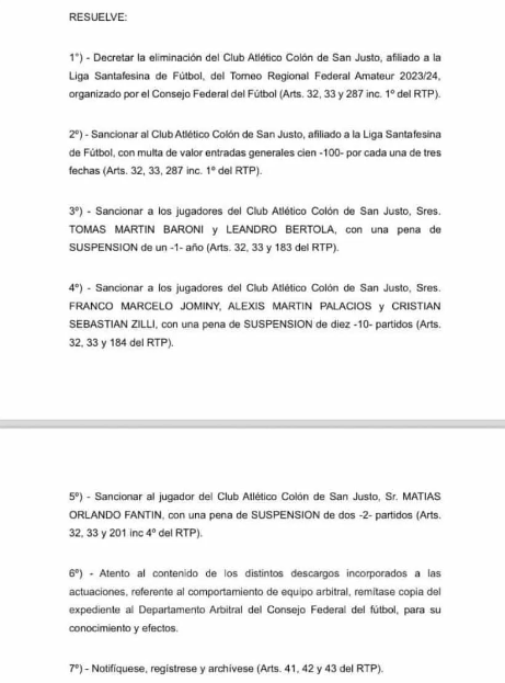 El tribunal resolvió eliminar con sanción (una multa) al equipo de la liga santafesina y también decidió suspender a seis futbolistas del club: a Tomás Martín Baroni y Leandro Bertola por 1 año; a Franco Marcelo Jominy, Alexis Martín Palacios y Cristian Sebastián Zilli por 10 partidos; y a Matías Orlando Fantin por 2 encuentros.