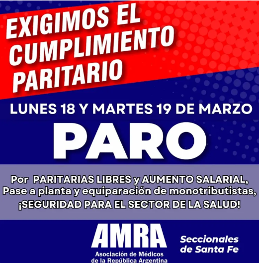 La Asociación de Médicos de la República Argentina, seccional Santa Fe, anunció un nuevo paro de 48 horas, el que se concretará el lunes 18 y martes 19 de marzo. La medida será sin asistencia a los lugares de trabajo, pero se mantendrá el cronograma de guardias y la atención de urgencias.