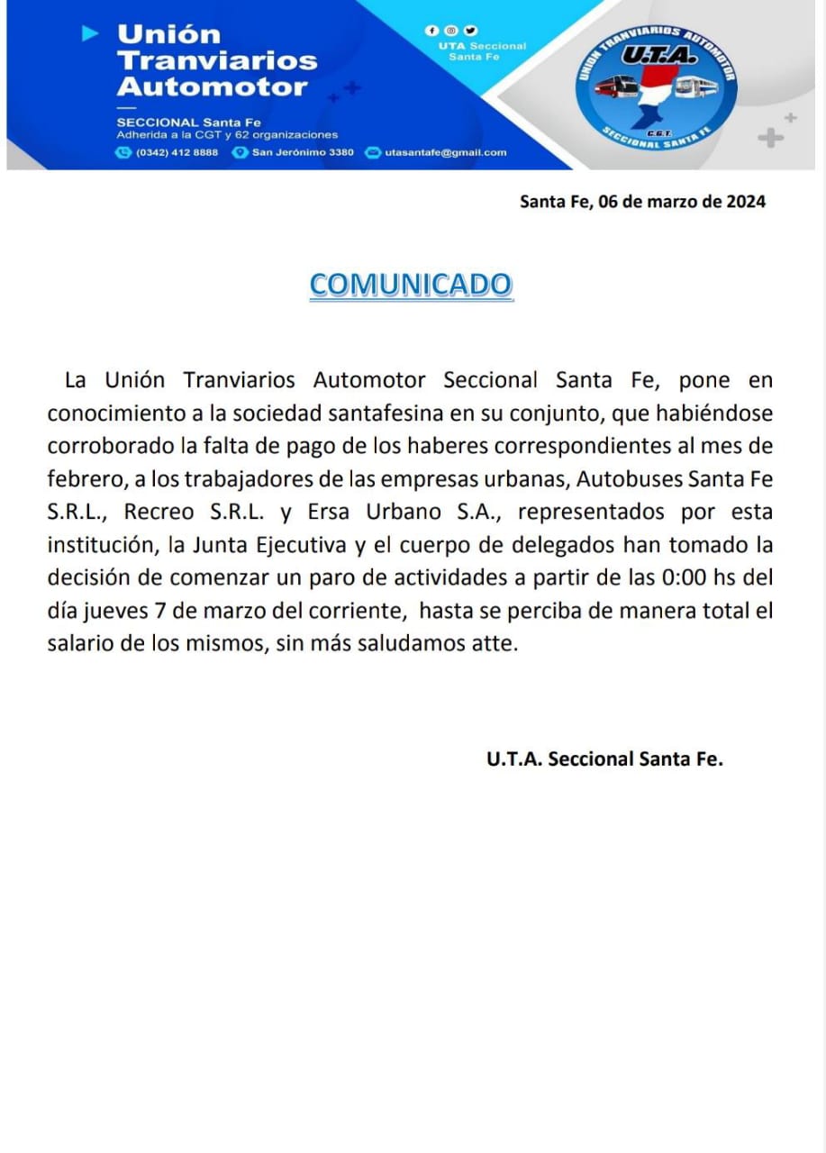 La Unión Tranviaria Automotor, seccional Santa Fe, decretó paro para este día jueves 07 de Marzo en la ciudad de Santa Fe debido a que los choferes solo han percibido el 40% de su salario.