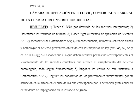 El 15 de Septiembre de 2023, Lorenzini estableció “Rechazar el pedido de homologación de la propuesta concordataria presentada por la sociedad Vicentin Saic” y “ordenar la apertura del período de concurrencia (Art. 48 Ley de Concursos y Quiebras)”. También afirma que “Mantiene la administración societaria en sus directores naturales y continúa la intervención societaria”. El plan que Vicentín pretendía homologar “No ofrece pautas claras para los acreedores que deberán esperar 12 años para cobrar el saldo de sus créditos”, sostiene el fallo.