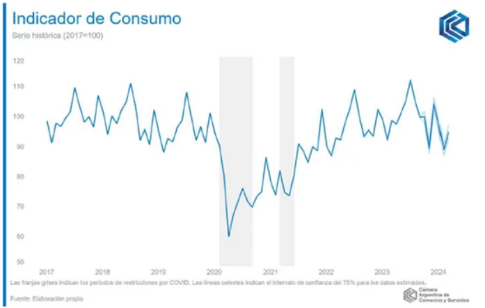 En marzo de 2024, el Indicador de Consumo (IC) de la Cámara Argentina de Comercio y Servicios (CAC) mostró un retroceso de 3,8% en la comparación interanual (i.a.).