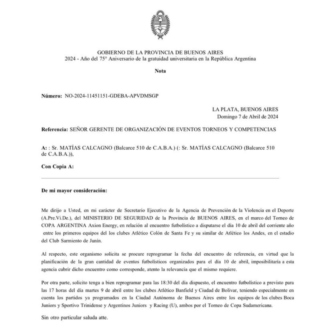 Quien comunicó oficialmente la situación en primer lugar fue el Club Los Andes. De este modo, el partido queda sin día ni hora de juego. A continuación, el comunicado de Aprevide:
