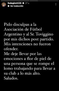 A dos días de lo acontecido, Girotti se retractó y pidió perdón a través de sus redes sociales: “Pido disculpas a la Asociación del Fútbol Argentino y al Sr. Toviggino por mis dichos post partido. Mis intenciones no fueron ofender”, escribió.
