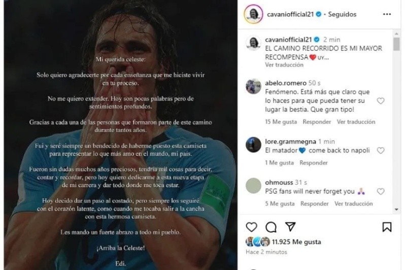 «Mi querida Celeste: sólo quiero agradecerte por cada enseñanza que me hiciste vivir en tu proceso. No me quiero extender. Hoy son pocas palabras pero de sentimientos profundos», fue lo primero que escribió Cavani, emblemático goleador de la Selección de Uruguay.