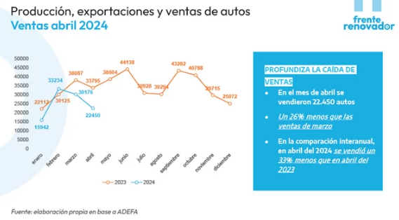 En lo relativo a la venta de automóviles También marca el movimiento negativo de las ventas. Aquí sostiene que se alcanzaron las 22.450 unidades, un 26% por debajo de los registros de marzo. En la comparación interanual, en abril del 2024 se vendió un 33% menos que en abril del 2023.