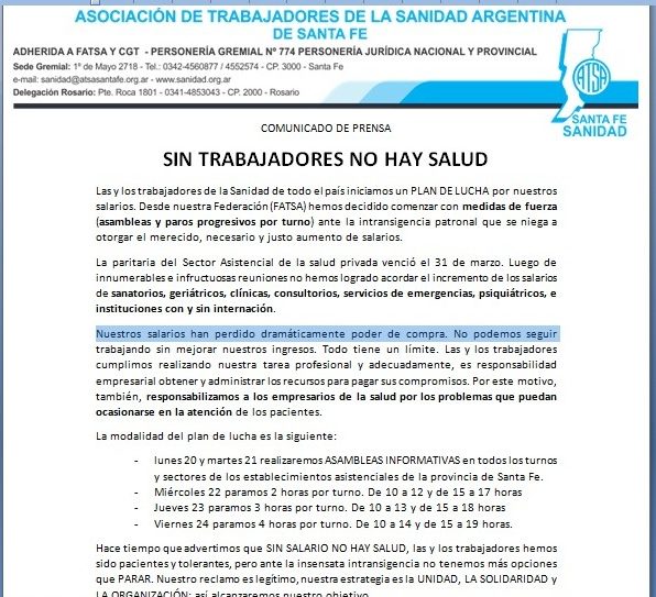El comunicado oficial señala que la paritaria del Sector Asistencial de la salud privada venció el 31 de marzo, y tras numerosas reuniones, no se ha logrado llegar a un acuerdo sobre el incremento salarial para los empleados de sanatorios, geriátricos, clínicas, consultorios, servicios de emergencias, psiquiátricos e instituciones con y sin internación.