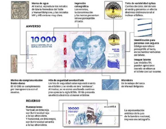El nuevo billete de $10.000 cuenta con medidas de seguridad incorporadas mediante sistemas de impresión especiales; entre otras, están las siguientes, destinadas principalmente al público en general, pero que además permitirán el reconocimiento por máquina: