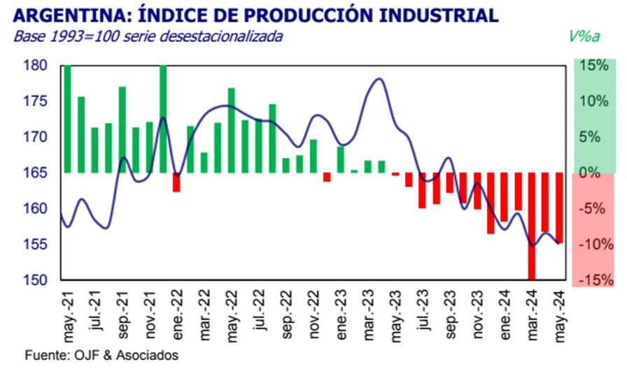 La producción industrial continúa afectada por los efectos de la recesión y dilata la esperada recuperación, volviendo a registrar una caída en mayo, que alcanzó el orden del 9,8% interanual, de acuerdo al Índice de Producción Industrial (IPI) que elabora la consultora Orlando J. Ferreres.
