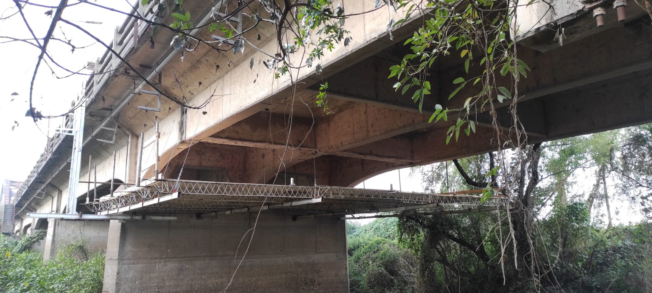 Vialidad Nacional controla la ejecución de los arreglos en el Puente Carretero de Ruta Nacional Nº 11. Dentro de los progresos se culmina el armado de los andamios colgantes en dos juntas ubicadas entre ambos arcos, plataformas desde las que se conformarán las ménsulas de hormigón armado. Cabe recordar que estos soportes adicionales se fijarán para suplementar los apoyos, como intervenciones preventivas en el caso de las juntas ubicadas entre el Vado y el río Salado.