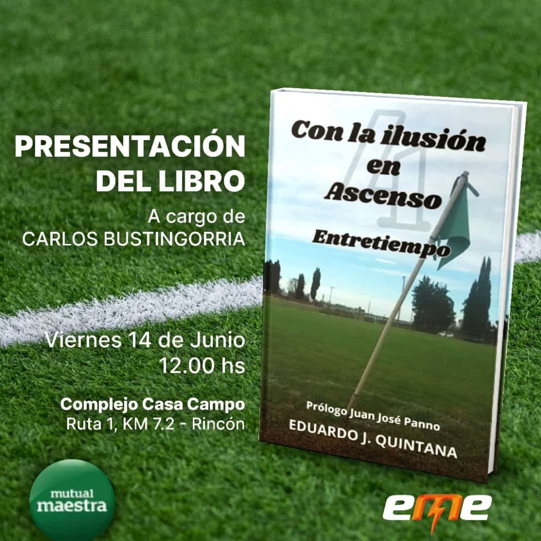 Los amantes del fútbol y la literatura tienen una cita imperdible este viernes, 14 de junio, en el Complejo Casa Campo de Mutual Maestra, ubicado en Ruta 1, KM7,2, Rincón. En esta ocasión, el reconocido autor Eduardo Quintana presentará su último libro titulado «Con la ilusión en ascenso – Entretiempo», una obra que promete cautivar a los lectores con sus cuentos futboleros.
