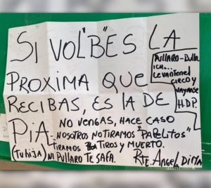 “Si volvés la próxima (cabeza) que recibas es la de…, tu hija. No vengas. Hacé caso, nosotros no tiramos papelitos. Tiramos tiros y muertos. Ni Pullaro te zafa. Pullaro-Bullrich…Levanten el circo y vayansé HDP”, decía el papel que se dejó en una caja.