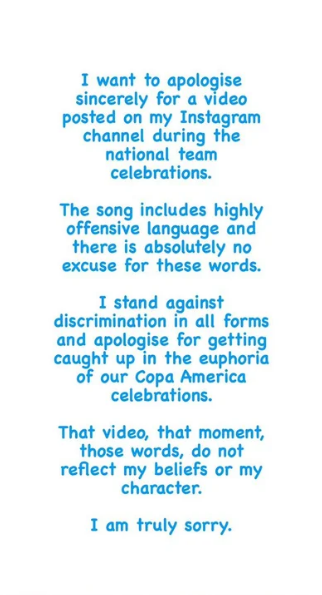 «Quiero disculparme sinceramente por el video publicado en mi cuenta de Instagram durante la celebración de la Selección. La canción tuvo alto contenido ofensivo y no hay justificación para eso», explicó el ex volante de River.