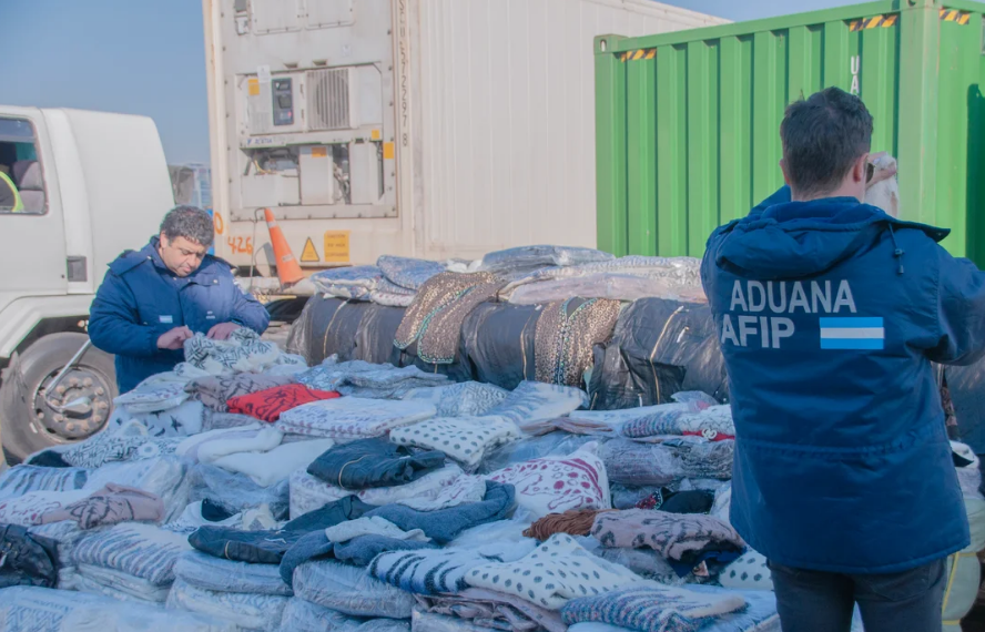 En este sentido, la autoridad indicó que hay 800 kilos de camperas, 1.600 kg de sweaters de punto, 2.450 kg de abrigo punto mujer, 2.400 kg de pantalones largos, entre otras piezas de indumentaria.