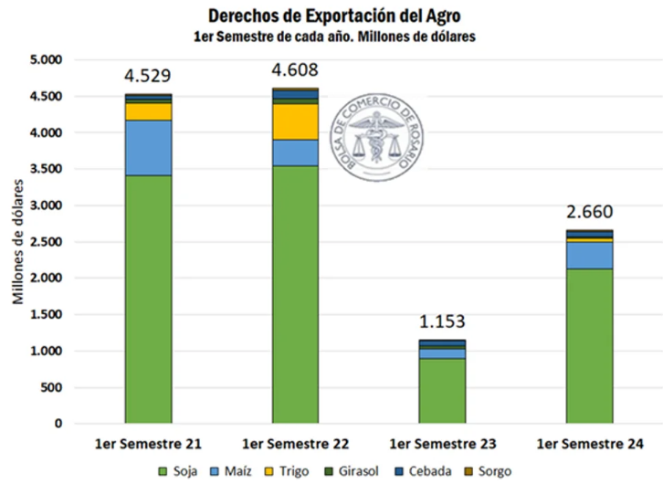 La entidad estimó que entre enero y junio, el agro aportó US$2.660 millones por Derechos de Exportación (DEX) a las arcas del Tesoro, lo implica un 160% más que el aporte de los primeros seis meses del 2023, con un estimado de US$1.153 millones en ese período.