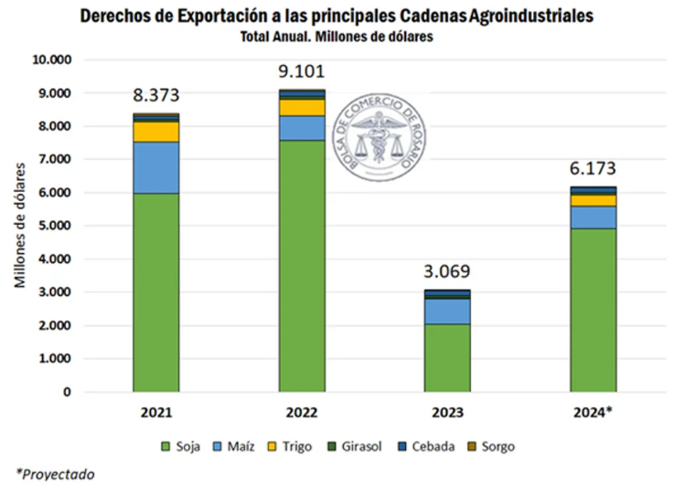 La recaudación por retenciones sobre el sector agropecuario se duplicó en el primer semestre del año frente al mismo periodo de 2023 pero se ubicó por debajo de los registros de 2021 y 2022, de acuerdo a un informe elaborado por la Bolsa de Comercio de Rosario (BCR).