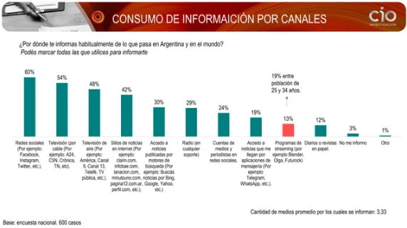 Cuentas de medios y periodistas en redes 24%, por aplicaciones (Whatsapp) 19% y streaming 13% (subiría a 19% si fuera entre público joven de 25 a 34 años), un punto encima de diarios y revistas impresos.