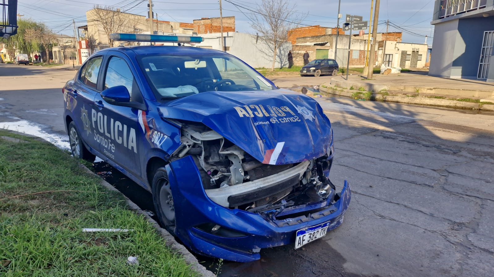 Un fuerte choque se produjo este viernes por la la mañana en el cruce de las calles Gobernador Freyre y Gorostiaga, en el barrio Los Hornos de la ciudad de Santa Fe. El accidente ocurrió cuando un patrullero, en el que circulaban dos efectivos policiales, chocó contra un automóvil.
