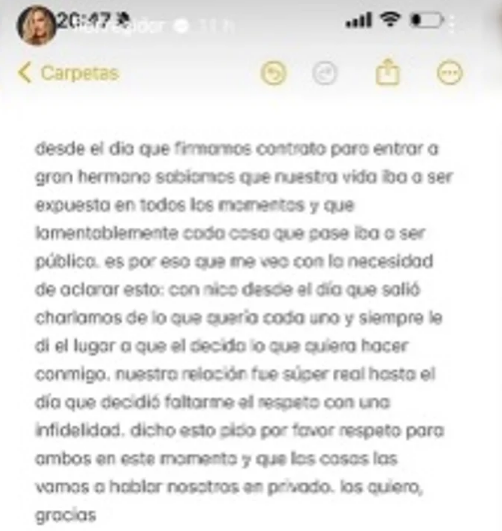 “Desde el momento en que firmamos el contrato para ingresar a Gran Hermano, sabíamos que nuestras vidas estarían expuestas en todo momento y que, lamentablemente, todo lo que ocurriera sería público”, dijo la modelo en sus historias de Instagram.