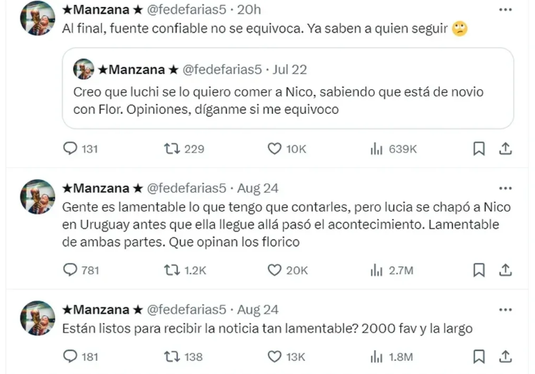 “Es lamentable lo que tengo que contar, pero Lucía se besó con Nico en Uruguay antes de que ella (Florencia) llegara. Eso ocurrió allí. Lamentable por ambas partes”, reveló el tucumano.