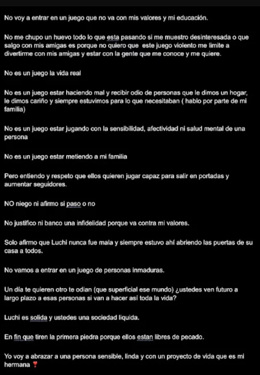 La hermana de la ex GH no negó que haya ocurrido la infidelidad: “No niego ni afirmo si pasó o no. No justifico ni banco una infidelidad porque va contra mis valores. Solo afirmo que Luchi nunca fue mala y siempre estuvo ahí, abriendo las puertas de su casa a todos. No vamos a entrar en un juego de personas inmaduras. Un día te quieren, otro te odian (qué superficial ese mundo). ¿Ustedes ven futuro a largo plazo a esas personas si van a hacer así toda la vida? Luchi es sólida y ustedes una sociedad liquida. En fin, que tiren la primera piedra porque ellos están libres de pecado. Yo voy a abrazar a una persona sensible, linda y con un proyecto de vida, que es mi hermana”.