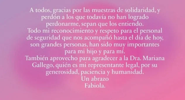 «Gracias por la solidaridad, entiendo a los que todavía no lograron perdonarme», dice el mensaje de Fabiola Yañez en la red social.