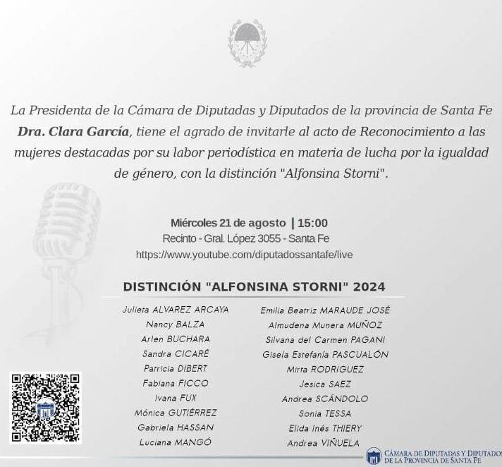 La Cámara de Diputados de la provincia de Santa Fe rindió homenaje a mujeres periodistas que han destacado en la lucha por la igualdad de género. La distinción «Alfonsina Storni» fue entregada a 20 mujeres de la provincia, en un acto que se llevó a cabo este miércoles a las 15 en el recinto de la Cámara de Diputados.