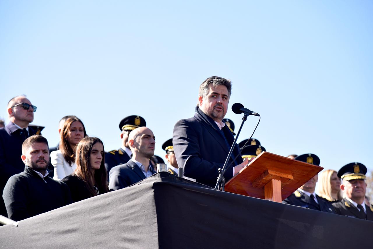 Más adelante, la presidenta de la Cámara de Diputados de la provincia, Clara García, recordó que cuando “el gobernador presentó ante la Legislatura de la Provincia un paquete de leyes que hacían a mejorar la seguridad y la justicia, allí a la cabeza estaba la Ley de Emergencia en Seguridad que decía que rápidamente, eficiente y austeramente, pudieran equiparse, pero además que dispusieran del orgullo y del respeto que la ciudadanía tiene hacia ustedes. Y hoy están aquí los abanderados y las abanderadas marcando ese camino”.