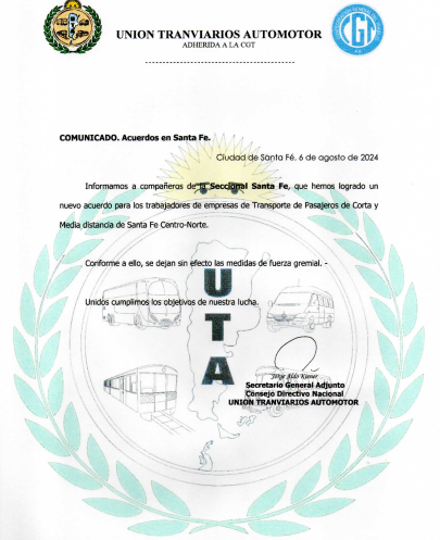 El paro de colectivos que había sido anunciado para esta semana en Santa Fe ha sido desactivado, según informó la Unión Tranviarios Automotor (UTA). La medida de fuerza, que estaba prevista para el miércoles, jueves y viernes, ha quedado sin efecto y el servicio de transporte urbano de pasajeros se mantendrá operativo durante toda la semana.