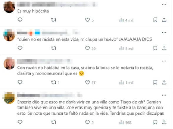 “Racista no, clasista. Lo que sea. Me chupa un huevo”, cerró Zoe Bogach, alimentando aún más sus polémicas declaraciones.