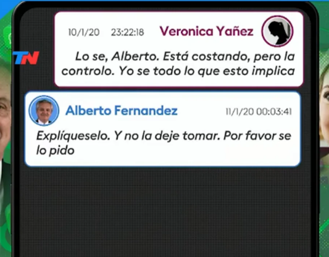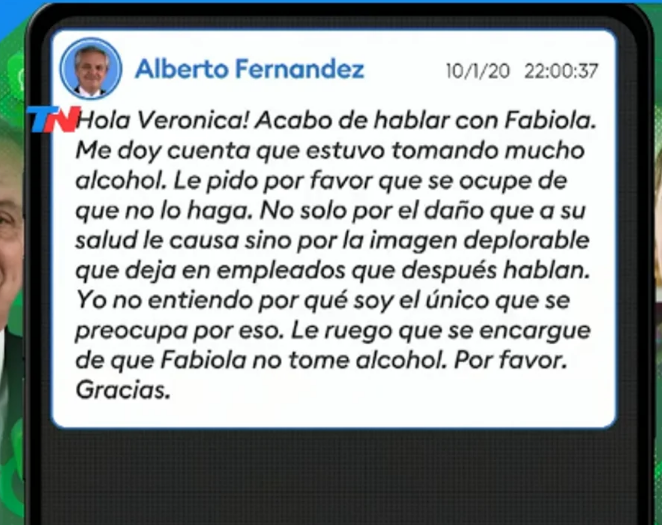 “Hola Verónica, acabo de hablar con Fabiola. Me doy cuenta que estuvo tomando mucho alcohol. Le pido por favor que se ocupe de que no lo haga” se puede leer en uno de los chats difundidos por la señal de noticias TN. “Yo no entiendo porque soy el único que se preocupa por eso”, agrega más adelante el la misma conversación.